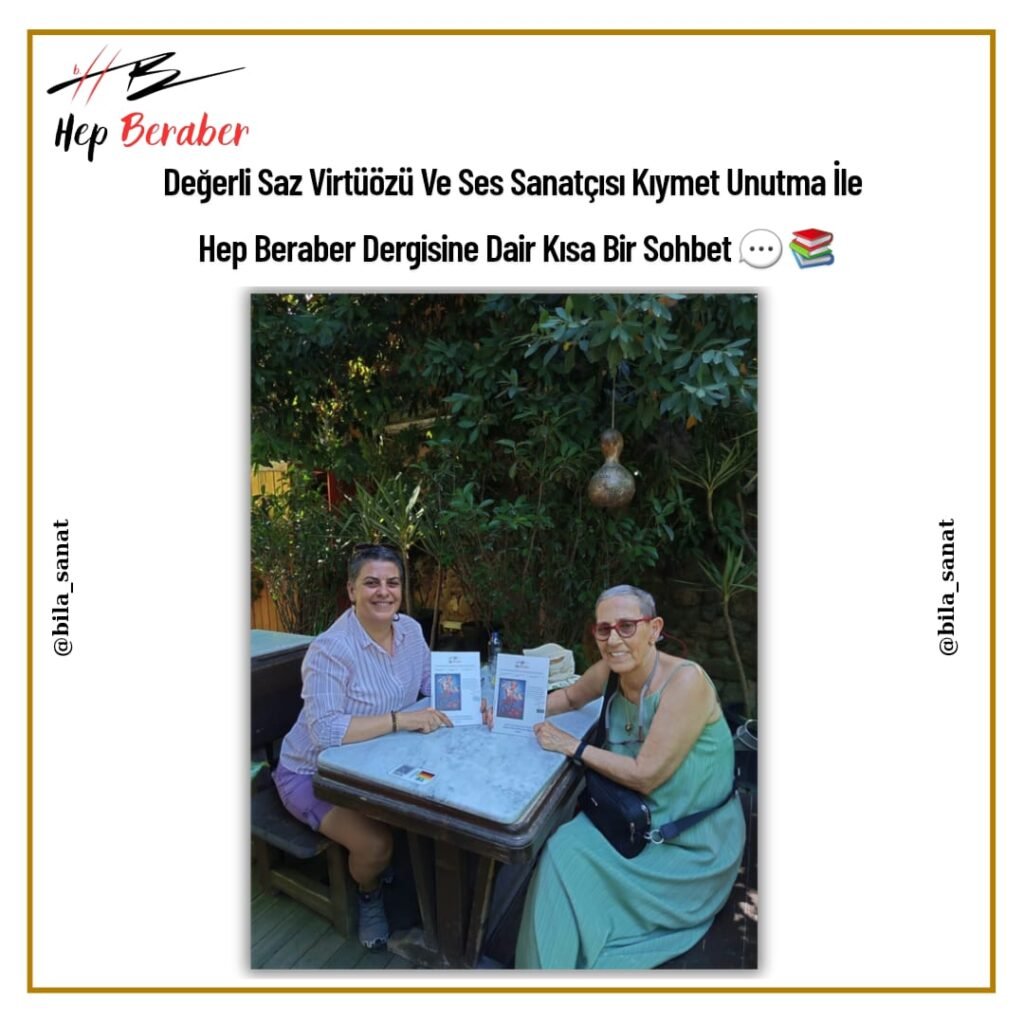 Bila Yayınları imtiyaz sahibi Aylin Koç’un sanat dünyasının değerli saz virtüözü ve ses sanatçısı olan Kıymet Unutma’ya Hep Beraber Dergisini takdim edip gerçekleştirdikleri kısa sohbetten güzel bir kare…💬🖊📚🍀